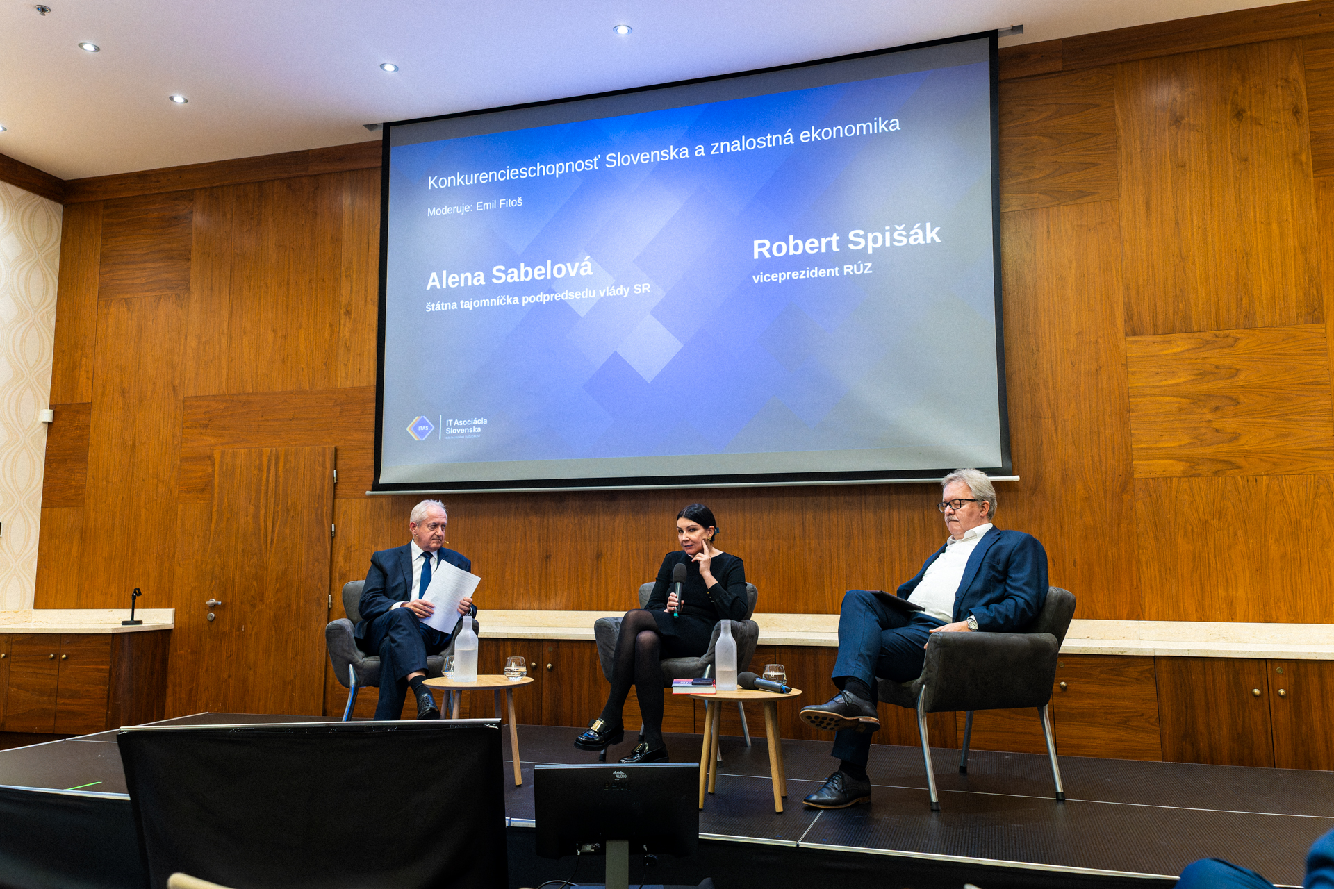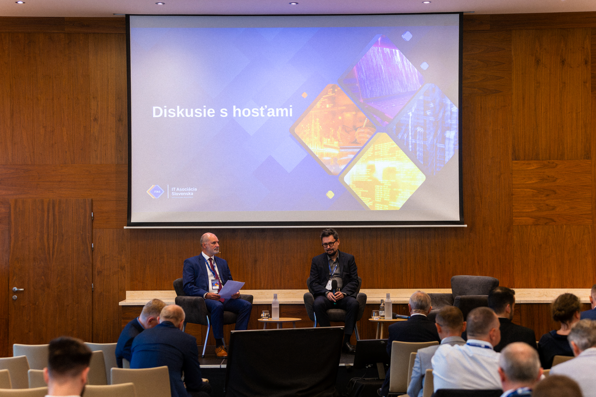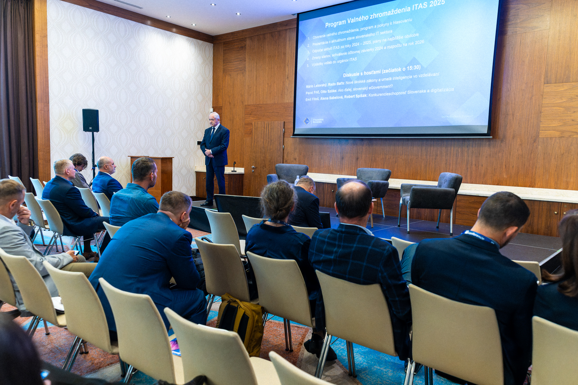 Po oficiálnej časti Valného zhromaždenia nasledovala diskusia s hosťami. Mário Lelovský privítal poradcu ministra školstva Rada Baťa – v diskusii sa venovali témam nových školských zákonov a umelej inteligencie vo vzdelávaní. Hosťom Pavla Friča bol Otto Szöke, generálny riaditeľ Sekcie informačných technológií verejnej správy na MIRRI SR. Témou bola budúcnosť slovenského eGovernmentu. V poslednom paneli Emila Fitoša diskutovala Alena Sabelová, štátna tajomníčka Úradu podpredsedu vlády SR pre plán obnovy, a Robert Spišák, viceprezident Republikovej únie zamestnávateľov. S prezidentom ITAS sa rozprávali o konkurencieschopnosti Slovenska a digitalizácii.